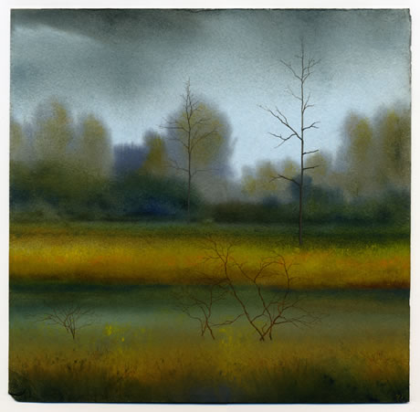 He is a developed sensual being, with an appreciation for music, dance and garden design. Scott’s love of nature, refreshed by frequent trips and hikes, is evident in his work, but its mood, often portrayed by impending weather, dominates the objects in the landscape. There are subtle references to change in the clouds and stronger references to death and loneliness in the leafless trees of his latest work, yet the mood is never hopeless, but lets us know that the next season, bringing the tiny leaves of Spring, is just beyond and approaching.